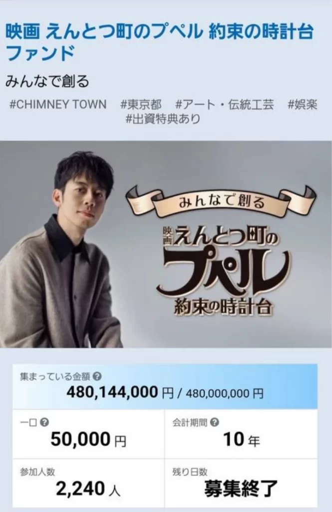 『映画 えんとつ町のプペル ~約束の時計台~』の事業投資型クラウドファンディングが、プロジェクト開始からわずか1日半で目標金額(満額)の【4億8000万円】を突破いたしました。